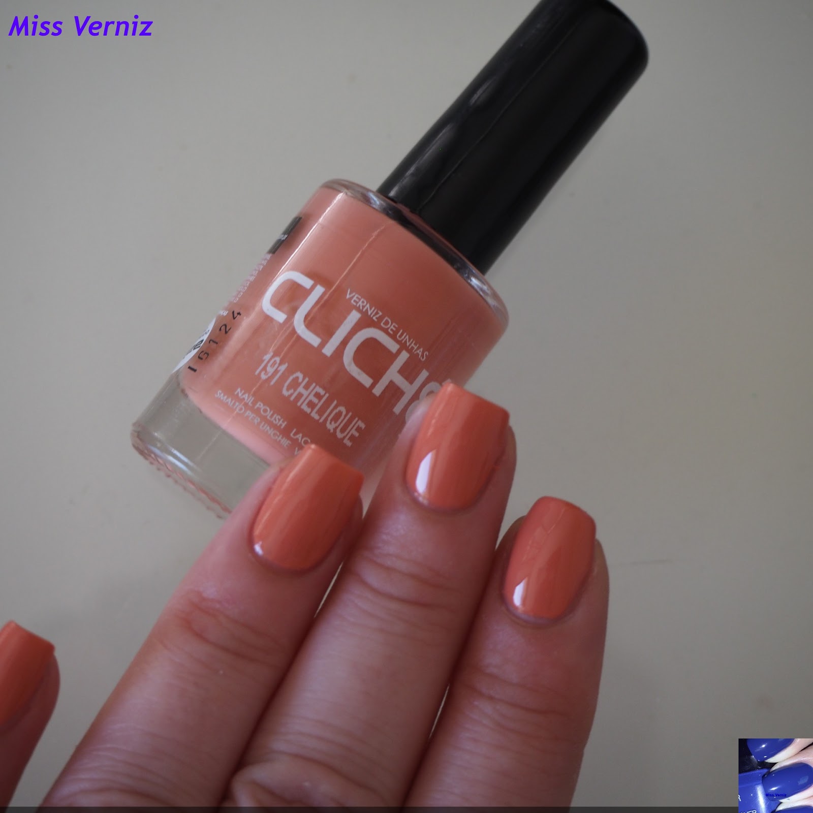 - Cliché 191 : Chelique (salmão-pêssego, cremoso e brilhante, duas camadas e sem ter aplicado Top Coat)